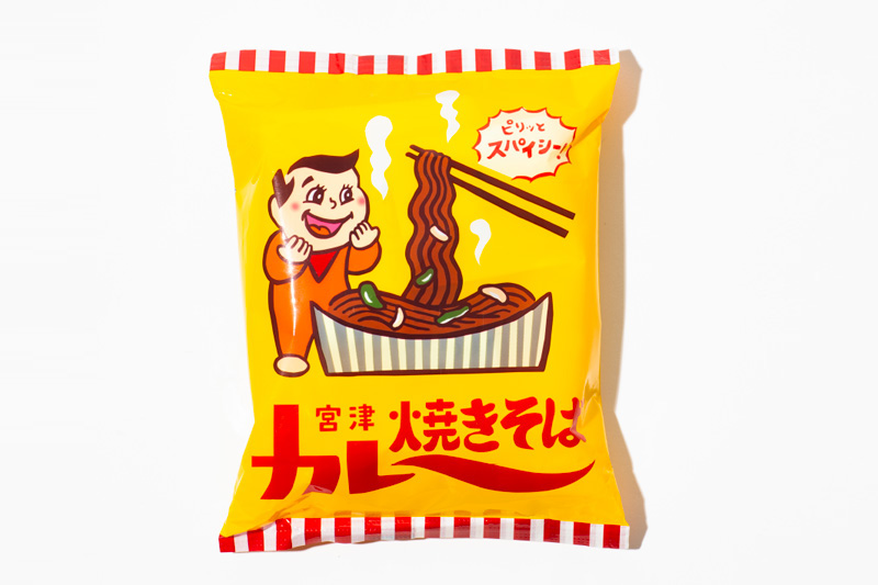 宮津のソウルフード、カレー焼きそばを家庭で手軽に味わえるインスタント麺。スパイシーなスープが麺と絡んでやみつきに。